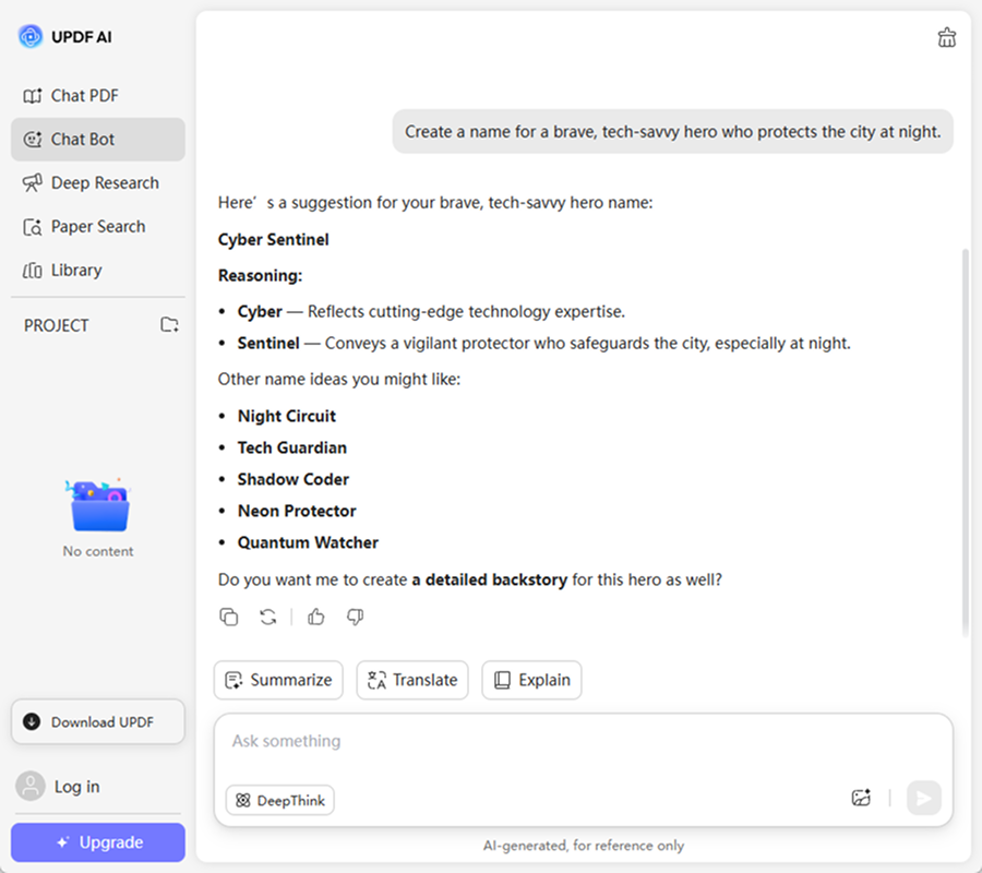 To begin, enter the traits, powers, or theme for your hero, e.g., “Create a name for a brave, tech-savvy hero who protects the city at night.” You can also select the desired style, such as heroic, mysterious, or playful.