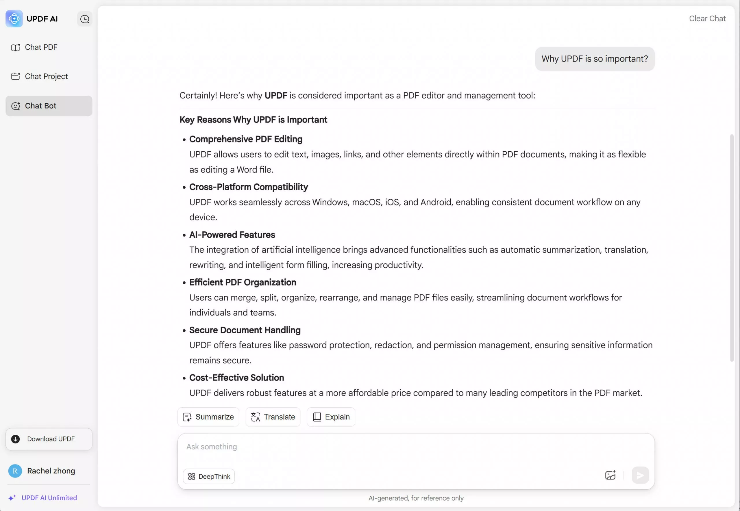 UPDF AI Online is the latest edition in the chatbot world. It is even better than both Grok AI vs ChatGPT. The tools use ChatGPT and DeepSeek together to generate more accurate and better results. Besides just chat, it also works great with files like PDFs. You can use it to analyse, summarise and translate the documents. Just click the button below to visit UPDF AI Online website to check it.