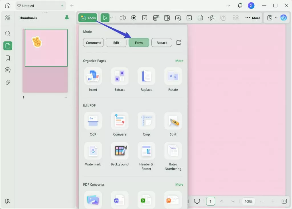 You can add interactivity to PDF in UPDF to let customers or collaborators engage with the catalog. Interactive elements in UPDF includes text field, check box, radio button, and more. Tap the "Form" option in Tools from the left sidebar and choose the relevant option from the top menu bar. Double-click to change its name or select a button style.