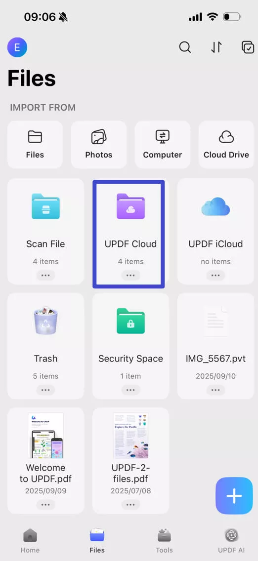 Step 1. As you download the UPDF iOS app on your iPhone (click the button below), open the "Files" tab from the bottom of the screen. Moving forward, click the "UPDF Cloud" button to access all the files stored in your storage.