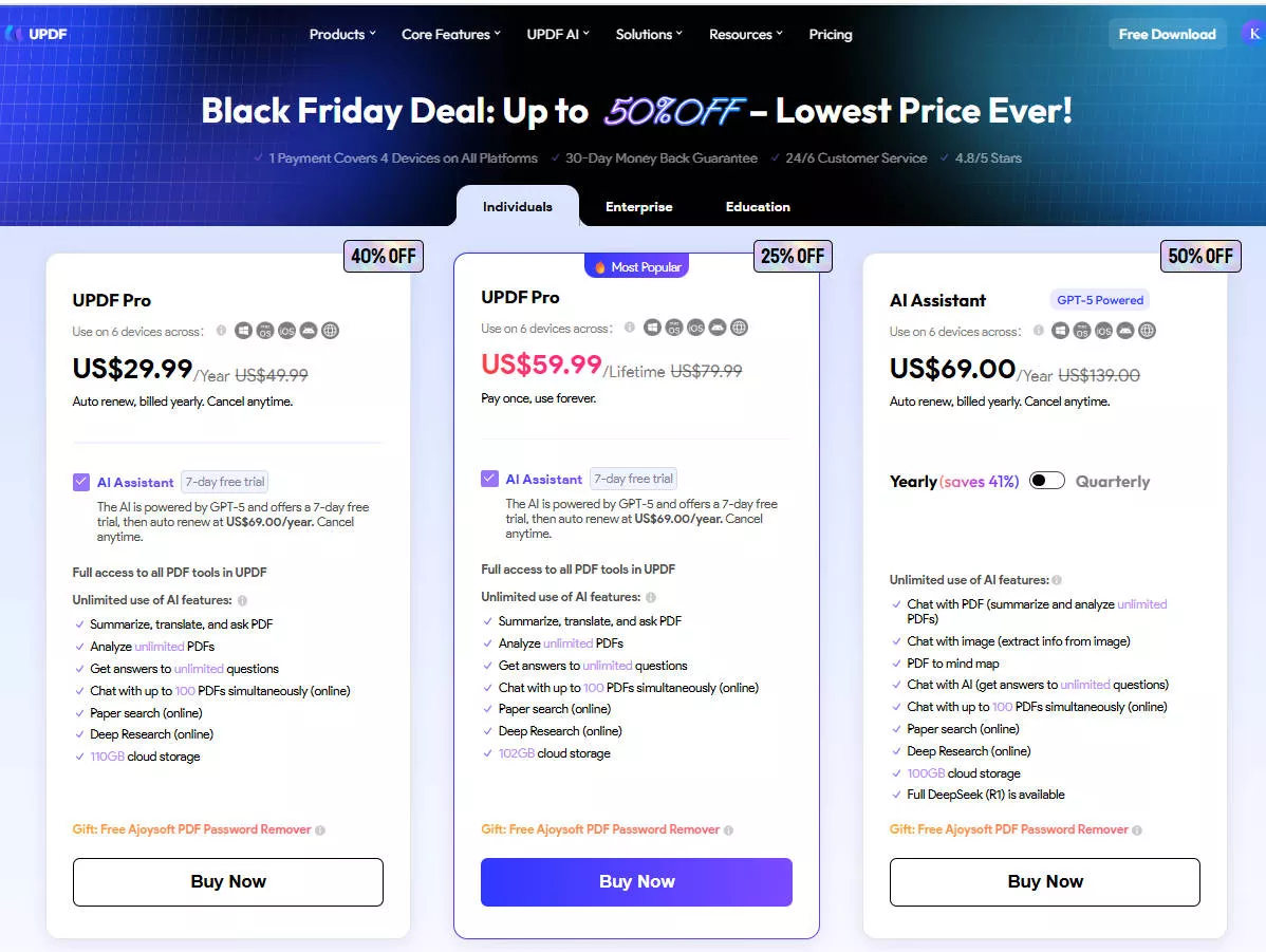 But before that, we would like to show you the biggest discount it has this month. You can get 50% off during this campaign. During the Black Friday campaign, UPDF is offering three main plans for different kinds of users: You can buy UPDF Pro for US$29.99/year, perpetual license for UPDF Pro and a Yearly license for UPDF AI for US$128.99, and UPDF AI Assistant for US$69.00/year. Moreover, the AI in UPDF Pro is free for you for the first 7 days. You can decide whether you need it after testing.