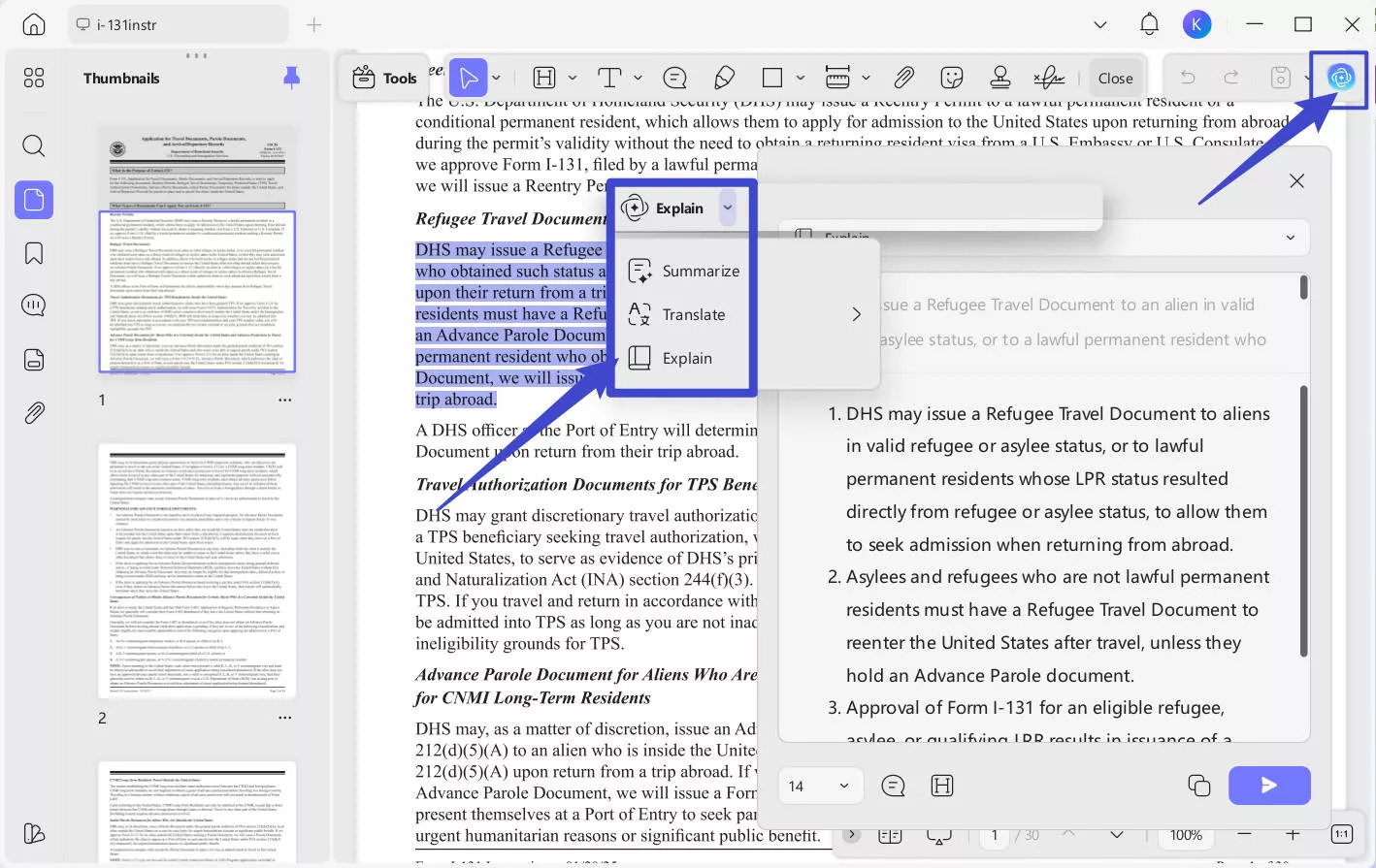You can use the UPDF AI to clarify some complicated terms of immigration or directly answer your questions. It is also possible to split the file and keep only the necessary parts, making the Form I-131 process more organized and transparent.