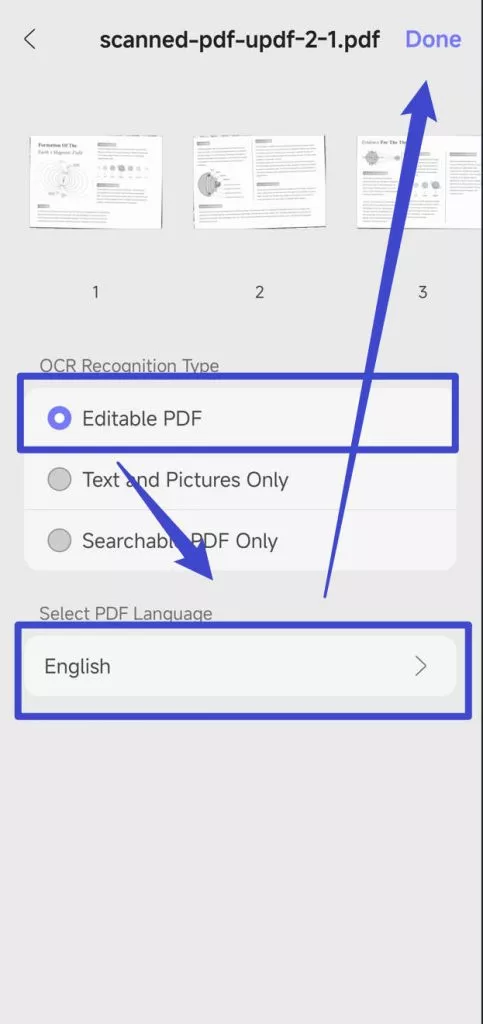 Step 2. Now, select the document language and tap on the "Done' to perform the OCR on the scanned PDF. Then, choose one place to save the editable PDF.